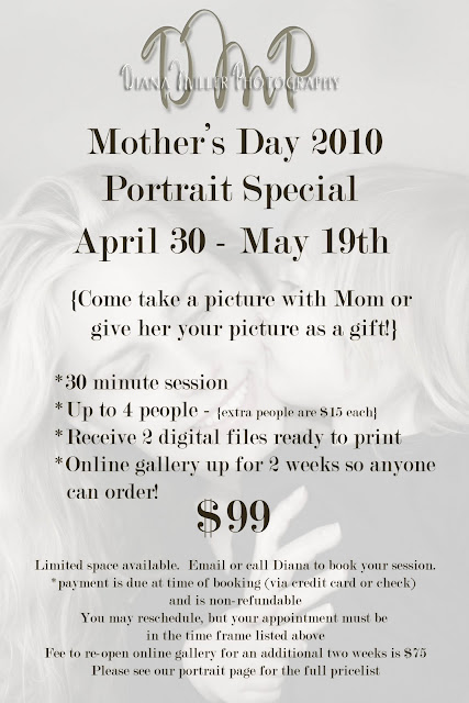 2010 Mother’s Day Special! by Diana Miller | May 4, 2010 | Sacramento Photographers We would love to see you for this exciting event! Please call for more info or questions!
