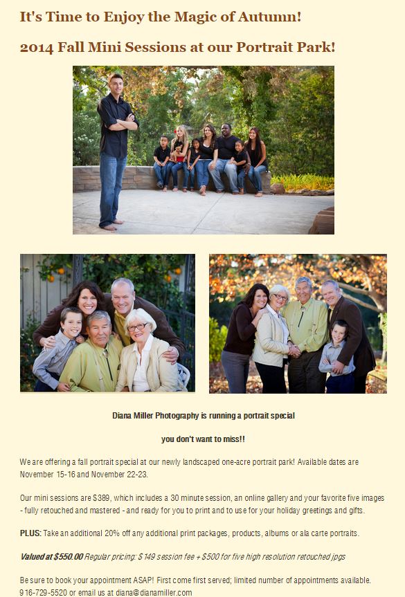 The fall leaves will be turning and the air will be fresh and crisp! Just in time for your Holiday cards and for gift giving.