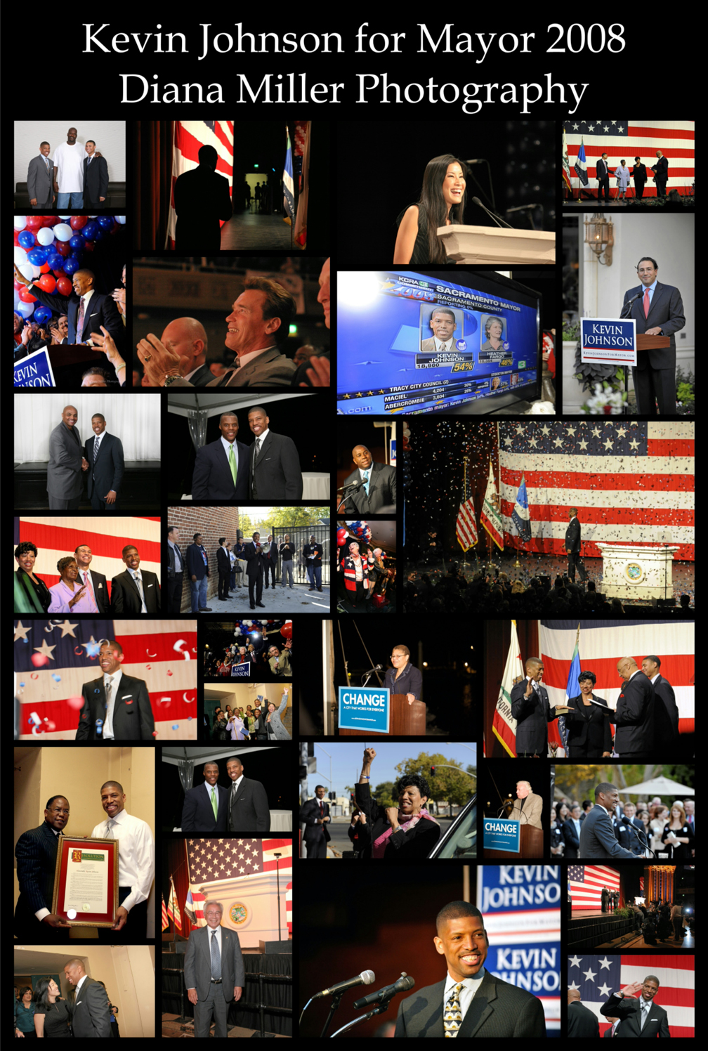 Diana Miller Photography was thrilled to be asked to be the official photographer for Mayor Kevin Johnson at his inauguration at the Memorial Auditorium in Sacramento, CA on November 25, 2008. Here is a compilation of some memorable shoots we did throughout the year with the Mayor. I also made this into a poster for the Mayor and for the key players in his election.