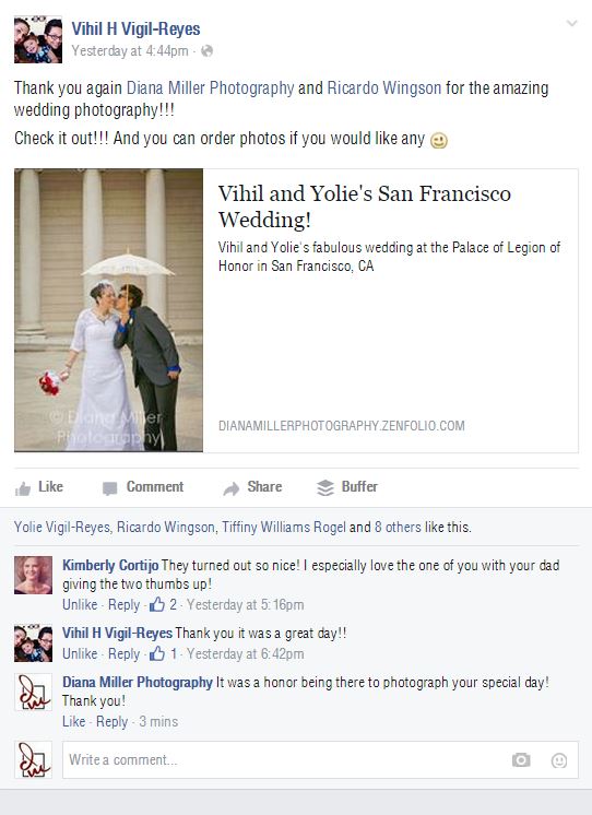 I received a thank you on Facebook from our bride, Vihil Vigil in May, 2015