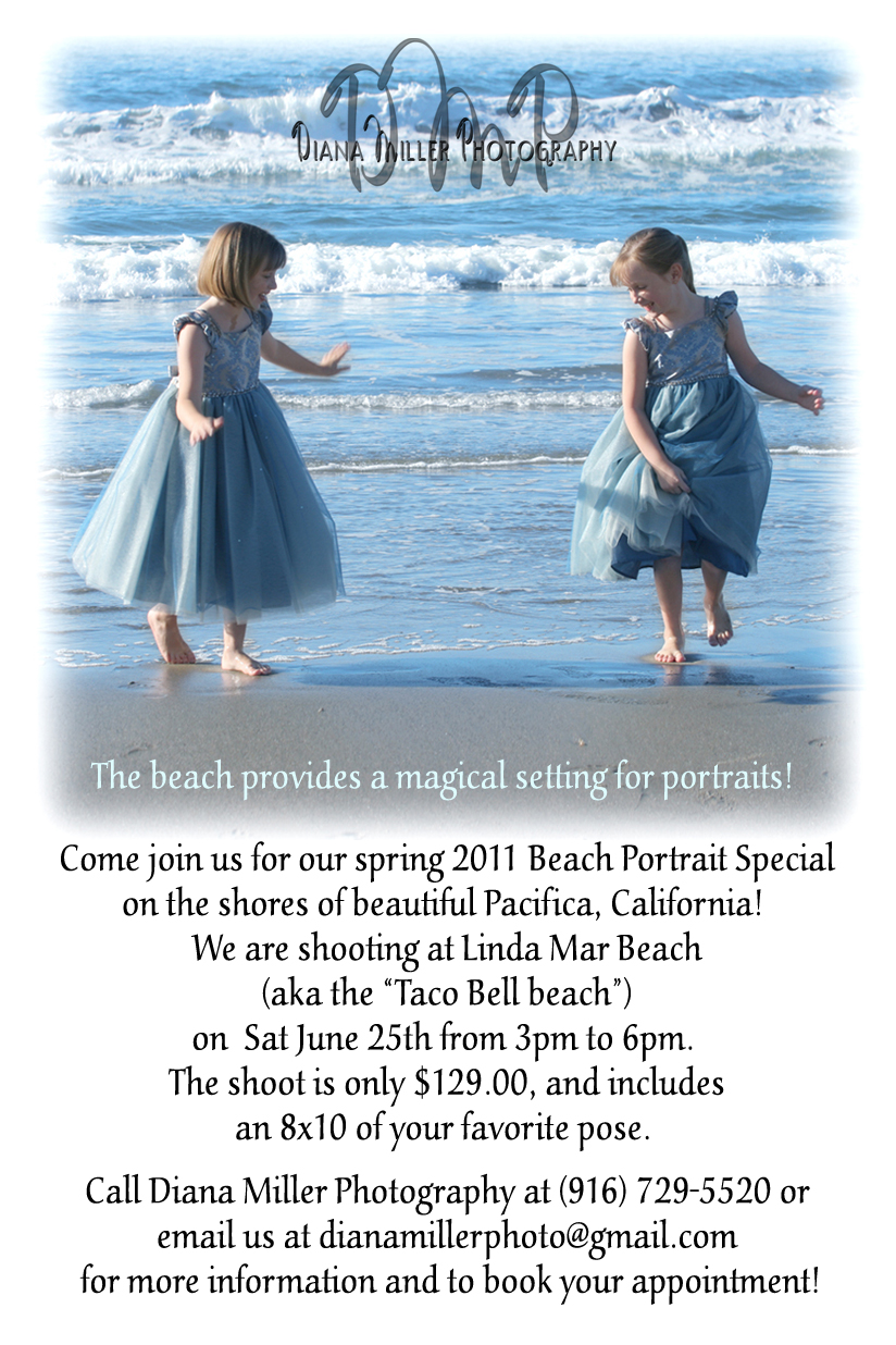 We are super excited to announce our first beach special of 2011! (Our first date of May 15th was rained out, then our second date of June 4th was rained out…so here is date #3!) We will be doing portraits on the beach in Pacifica on Saturday, June 25th from 3 – 7pm. The shoot is only $129.00, and includes an 8×10 of your favorite pose. We will take several poses of your family, so think ahead on what you would like to have for display in your home. We will send complete directions as well as portrait tips and guidelines to those that book that session.